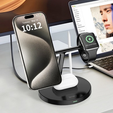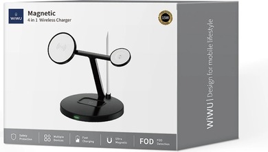 WIWU Wi-W032 Magnetic 4 in 1 Cableless Charger - это современное беспроводное зарядное устройство, способное одновременно заряжать до четырёх устройств: смартфон, умные часы, наушники и дополнительный гаджет.