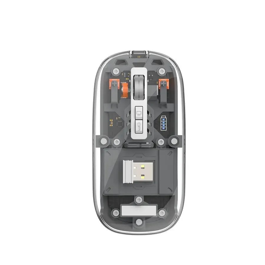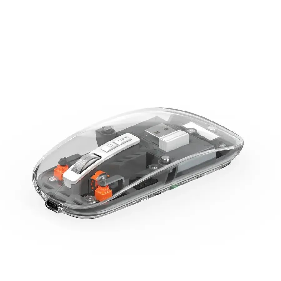 Беспроводная мышь с новой технологией, называемой бесшумной осью, для снижения рабочего шума. Имеет ультратонкий и уникальный прозрачный дизайн. Оснащена встроенной прочной аккумуляторной батареей емкостью 400 мАч, которая может работать до 500 часов после одной зарядки. Эта энергоэффективная мышь автоматически переходит в спящий режим через 5 минут бездействия. Соединения Bluetooth 5.1 + Bluetooth 5.1 и USB 2,4 ГГц позволяют мыши подключать до 3 совместимых устройств.