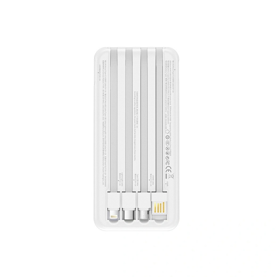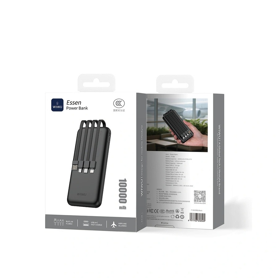 Оставьте лишние кабели дома. Power Bank WiWU Essen — это по-настоящему универсальное решение для зарядки, которого вы так долго ждали. Благодаря мощному аккумулятору емкостью 10000 мАч и четырем встроенным зарядным кабелям (Lightning, Micro-USB, TYPE-C и USB-A для подзарядки), этот Power Bank готов к любой ситуации. Заряжайте свой iPhone, планшет Android и беспроводные наушники одновременно. Тонкий, минималистичный корпус из ABS-пластика отличается прочностью, а интегрированная конструкция гарантирует, что у вас будет все необходимое в одном элегантном и портативном устройстве.