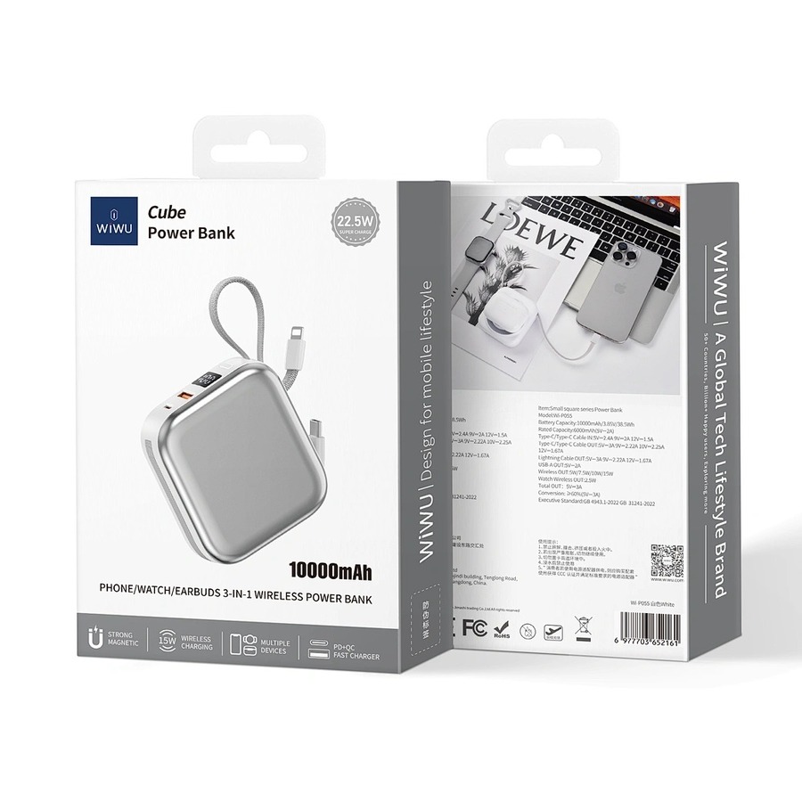 Упростите свои потребности в электропитании с помощью портативного зарядного устройства WiWU Cube 5-в-1. Это универсальный портативный зарядный центр, предназначенный для питания всех ваших устройств. На основной поверхности расположен магнитный беспроводной зарядник мощностью 15 Вт для вашего смартфона и специальный модуль мощностью 2,5 Вт для ваших Apple Watch. В боковых сторонах аккуратно размещены два встроенных кабеля для быстрой зарядки — один USB-C и один Lightning — готовые к подключению вашего планшета или других гаджетов. Нужен еще один порт? Дополнительный порт USB-A поддерживает сверхбыструю зарядку мощностью до 22,5 Вт. Четкий цифровой дисплей отображает оставшиеся 10000 мАч заряда, а компактный кубический дизайн со встроенным ремешком делает его невероятно удобным для переноски. Это единственное портативное зарядное устройство, которое вам нужно, чтобы все ваши устройства были заряжены, где бы вы ни находились.