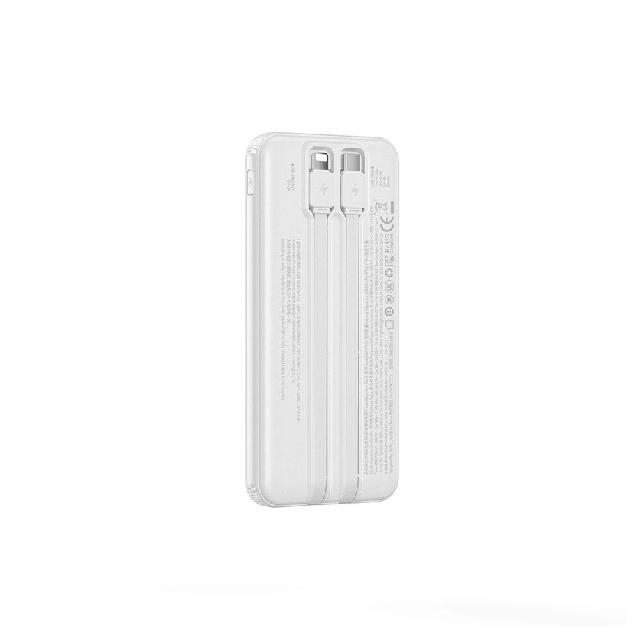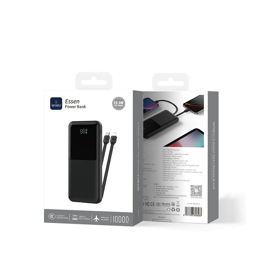 Ощутите настоящую свободу зарядки с портативным зарядным устройством WiWU Essen 10000mAh. Тщательно разработанное для максимального удобства, оно оснащено двумя встроенными кабелями для быстрой зарядки — одним для устройств с разъемом USB-C и одним для iPhone — так что вам больше никогда не придется беспокоиться о том, что вы забудете кабель. Нужно больше энергии? Высокоскоростной USB-порт обеспечивает мощность до 22,5 Вт для быстрой зарядки ваших гаджетов. Элегантный цифровой дисплей позволяет с первого взгляда увидеть оставшийся заряд, а текстурированный двухцветный дизайн придает устройству премиальный внешний вид и приятные тактильные ощущения. Это единственное портативное зарядное устройство, которое вам когда-либо понадобится.