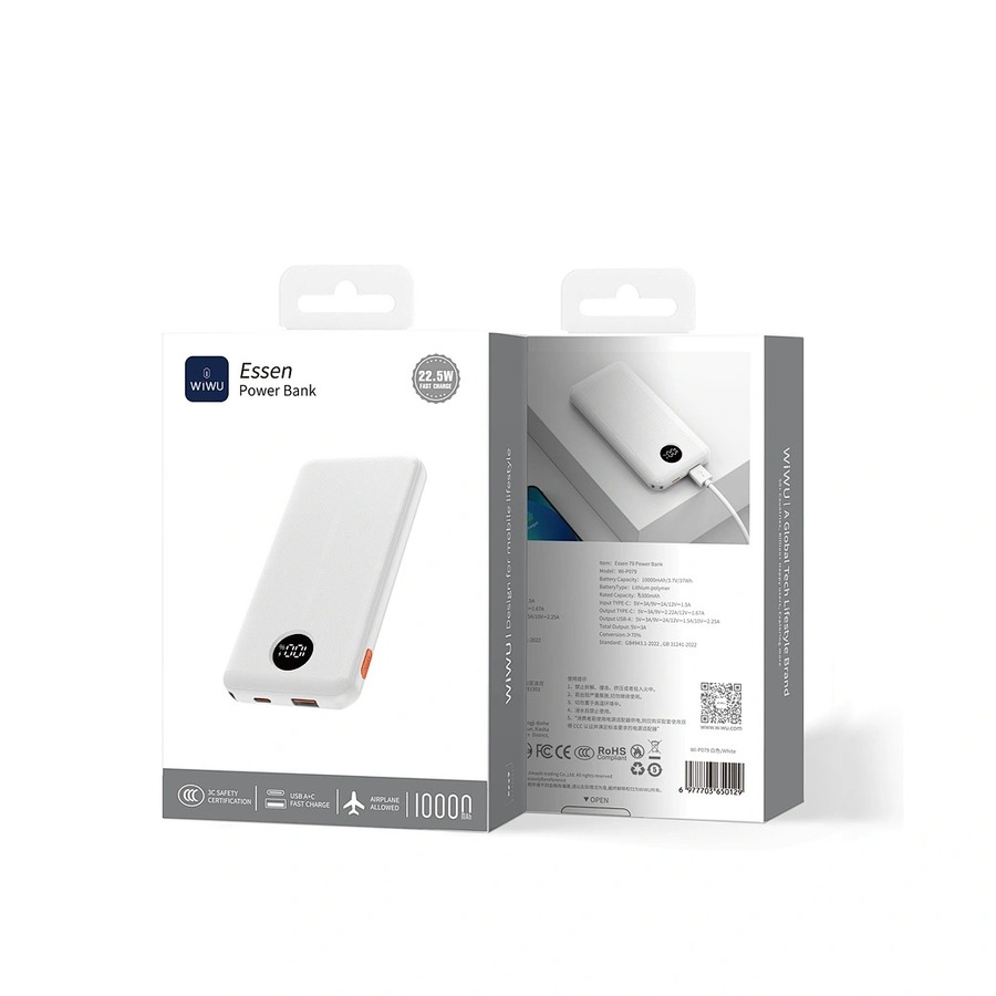 Мгновенно зарядитесь с помощью портативного зарядного устройства WiWU Essen 10000mAh с цифровым дисплеем. Разработанное для современного динамичного образа жизни, это устройство не только обладает достаточной энергией для многократной зарядки вашего смартфона, но и делает это с невероятной скоростью благодаря поддержке PD и QC. Встроенный светодиодный цифровой дисплей мгновенно отображает оставшийся заряд, поэтому вы никогда не окажетесь в затруднительном положении. Тонкий, прочный корпус из ABS-пластика и легкий вес делают его идеальным и надежным спутником в путешествиях, на работе или в любой день, когда вам нужен дополнительный заряд.
