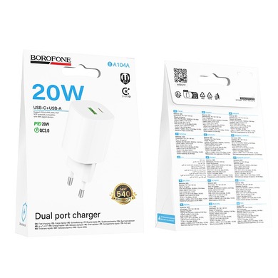 Сетевой адаптер питания Borofone BA104A PD 20W (EU) — компактное и мощное решение для быстрой зарядки ваших устройств дома, в офисе и в поездках.
